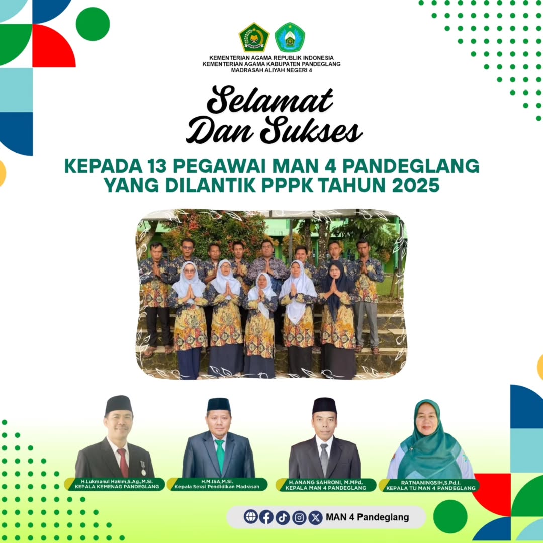 Keluarga besar MAN 4 Pandeglang turut mengucapkan selamat dan barakallah kepada 13 pegawai yang telah dilantik. Semoga amanah ini dapat dijalankan dengan penuh dedikasi dan menjadi langkah maju dalam penguatan kualitas layanan pendidikan di madrasah.
