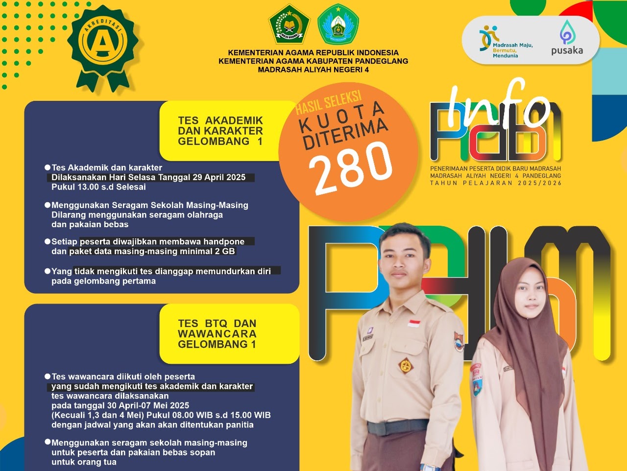 Pandeglang – Madrasah Aliyah Negeri (MAN) 4 Pandeglang resmi membuka pendaftaran Penerimaan Peserta Didik Baru Madrasah (PPDBM) Tahun Pelajaran 2025/2026. Pendaftaran gelombang pertama telah dibuka sejak 14 April 2025 pukul 15.00 WIB secara daring melalui laman resmi: ppdbman4pandeglang.sch.id.