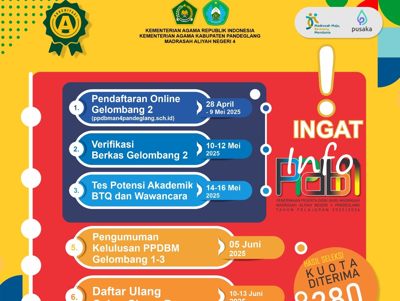 Informasi lengkap mengenai jadwal dan prosedur PPDBM tersedia di laman resmi madrasah dan media sosial resmi MAN 4 Pandeglang.