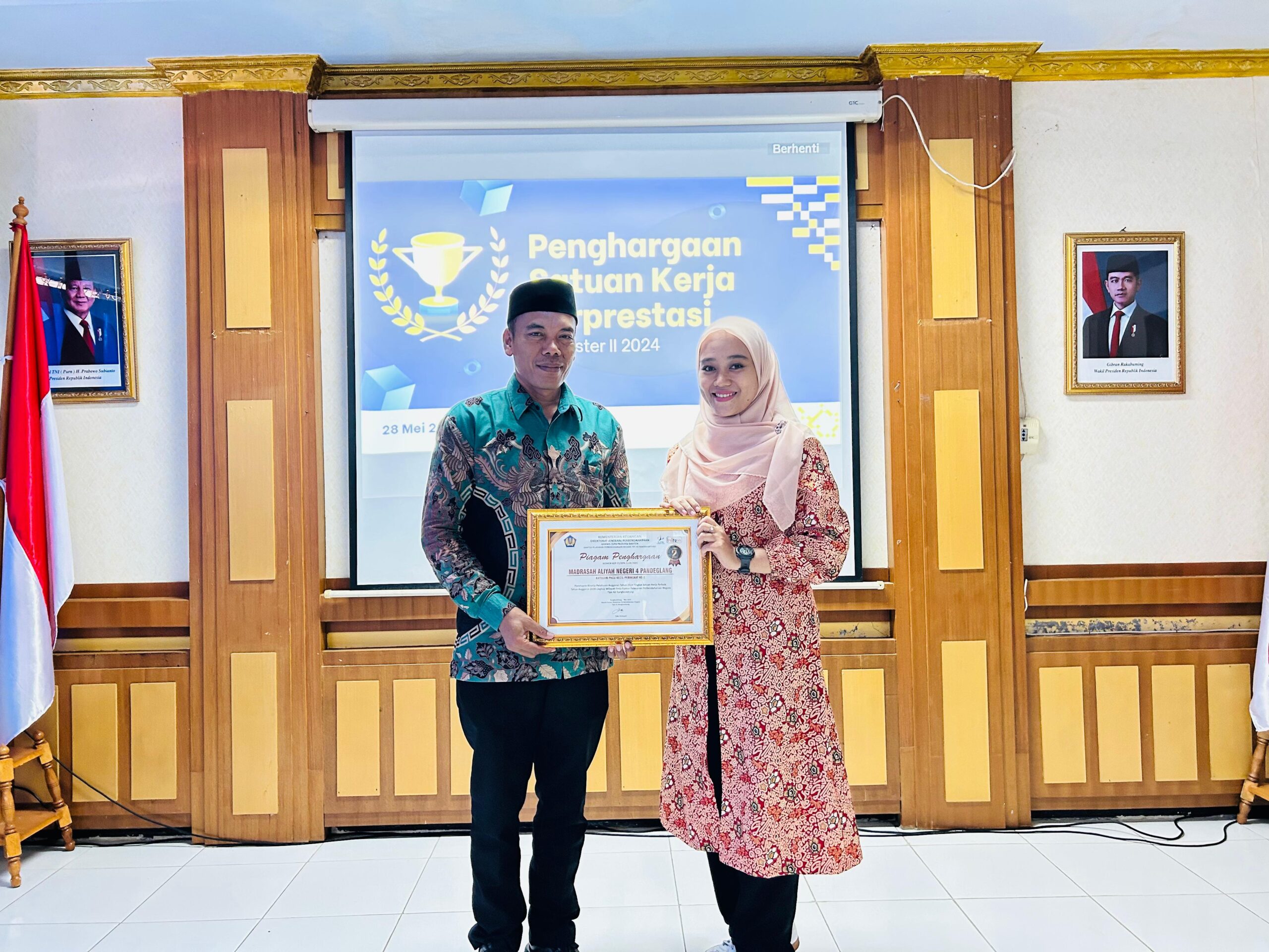 PANDEGLANG – Madrasah Aliyah Negeri (MAN) 4 Pandeglang meraih penghargaan Terbaik II dalam kategori Pagu Kecil pada ajang Penetapan Kinerja Pelaksanaan Anggaran Tahun 2024. Penghargaan diserahkan langsung oleh Kepala Kantor Pelayanan Perbendaharaan Negara (KPPN) Rangkasbitung sebagai bentuk apresiasi atas kinerja pengelolaan anggaran yang dinilai tertib, transparan, dan akuntabel.
